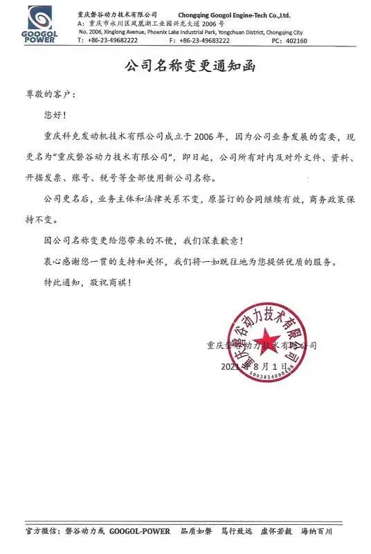 我司近日收到重庆科克发动机技术有限公司发的《公司名称变更通知涵》的通知,重庆科克发动机技术有限公司因业务发展的需要,现更名为“重庆磐谷动力技术有限公司”。
