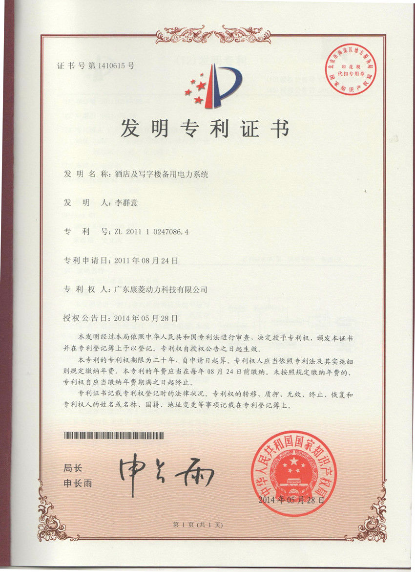 日前,我司又有一项发明专利获得国家知识产权局授权,此项专利名称为“酒店及写字楼备用电力系统发明”,专利号为ZL201110247286.4。 本发明涉及电力系统领域技术,尤其是指一种白金六星级酒店及超甲级写字楼备用电力系统。