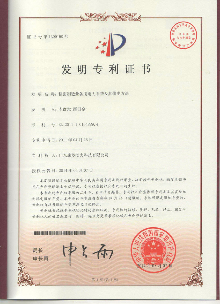 通过多年来努力,截止目前我司共拥有授权专利共42件,其中发明8件,实用新型25件,外观设计9件;在审专利7件,其中发明6件,实用新型1件。本次“精密制造业备用电力系统及其供电方法”专利的获得不仅来自全体伙伴们的辛苦努力更是为我司在创新道路上又增加一笔新的辉煌。