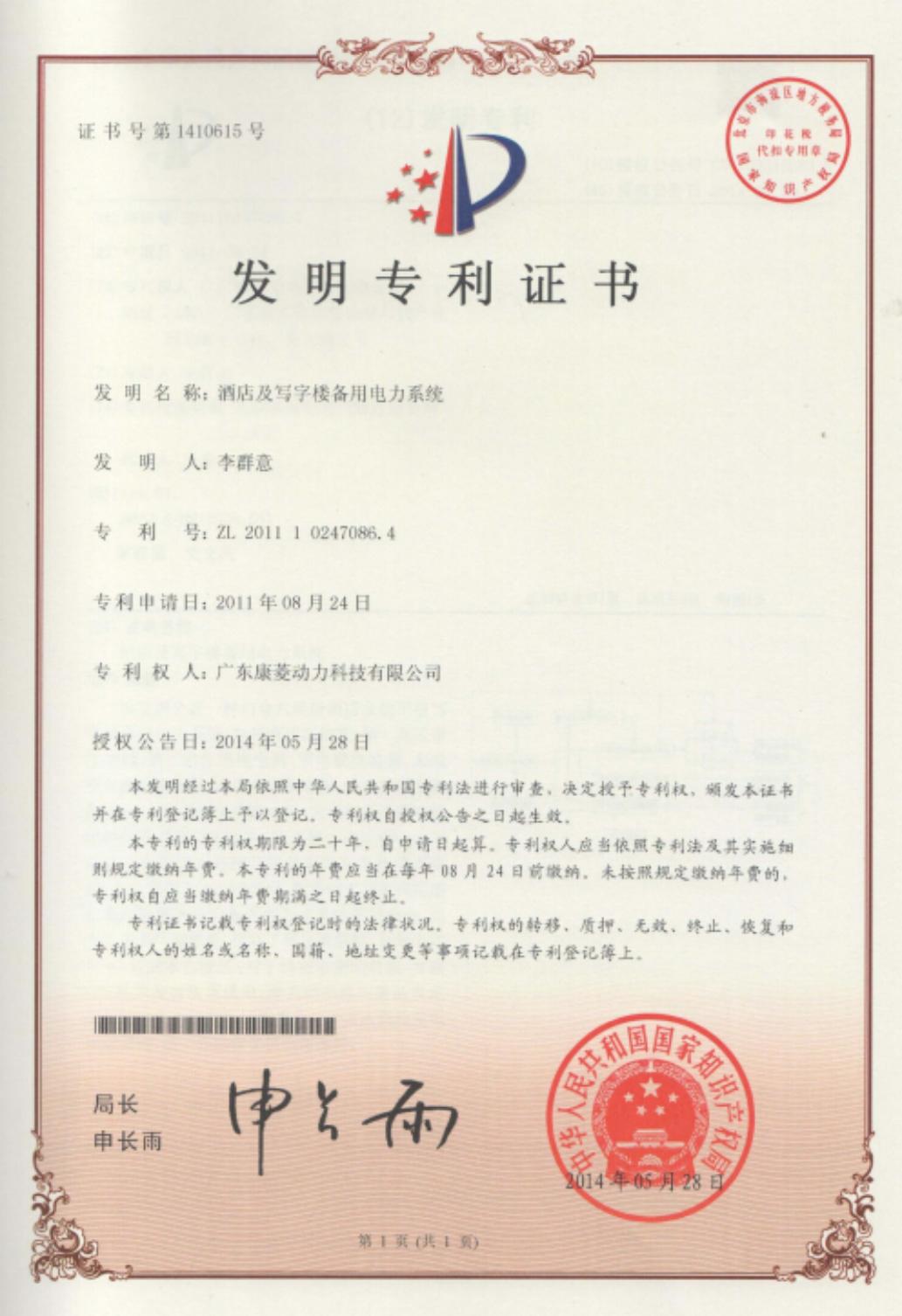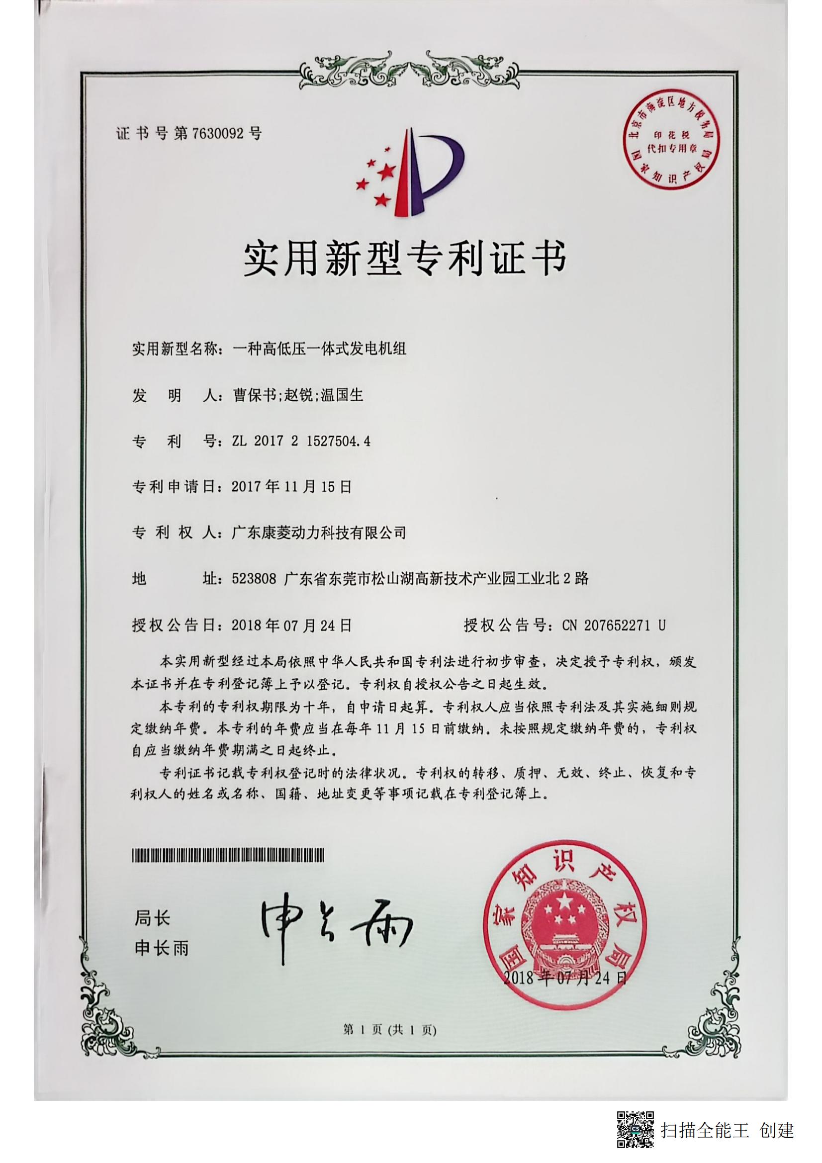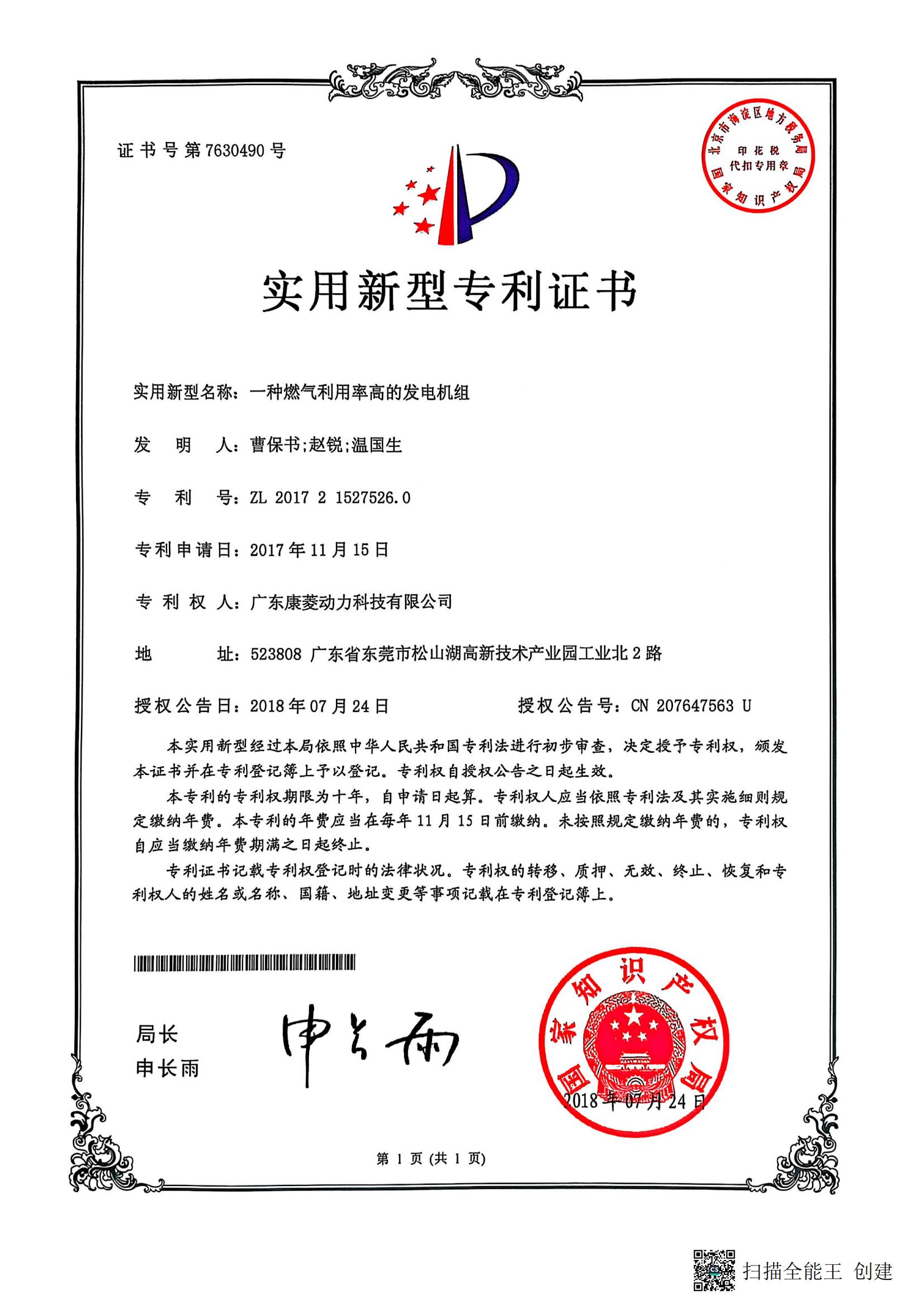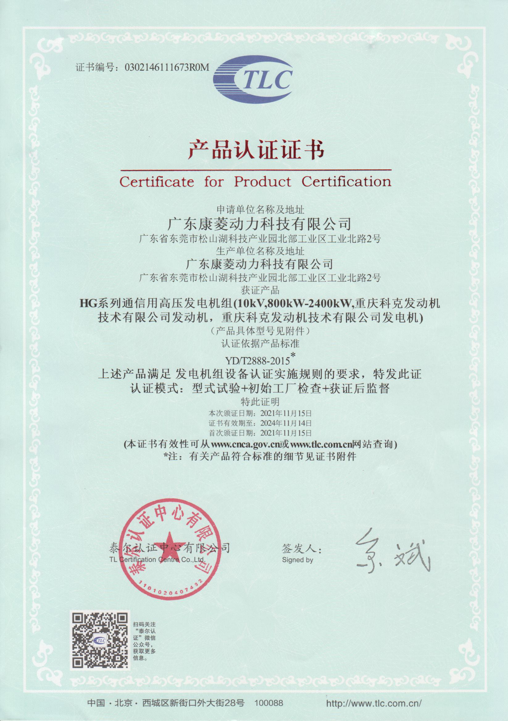 经过30多年的不懈努力,公司通过了IS09001质量管理认证,IS014001环境认证,OHSAS18001职业健康认证,GB/T29490知识产权管理体系认证;康菱系列发电机组产品先后通过CE认证、通信电源产品泰尔认证等认证,荣获国家级高新技术企业;曾荣获HG系列大马力柴油发电机组广东省自主创新产品、广东省著名商标、广东省名牌产品、广东省价格平台创始会员、东莞民营企业50强、连续多年广东省重合同守信用企业、东莞市装备制造业重点企业、东莞市中小民营创新产业化示范基地、东莞市专利培育企业、东莞市民营科技企业、东莞市质量协会理事单位;康菱HG系列发电机组获得国家标准委颁发采用国际标准产品证书、广东省质量技术监督局颁发的国际标准产品认可证书等殊荣。