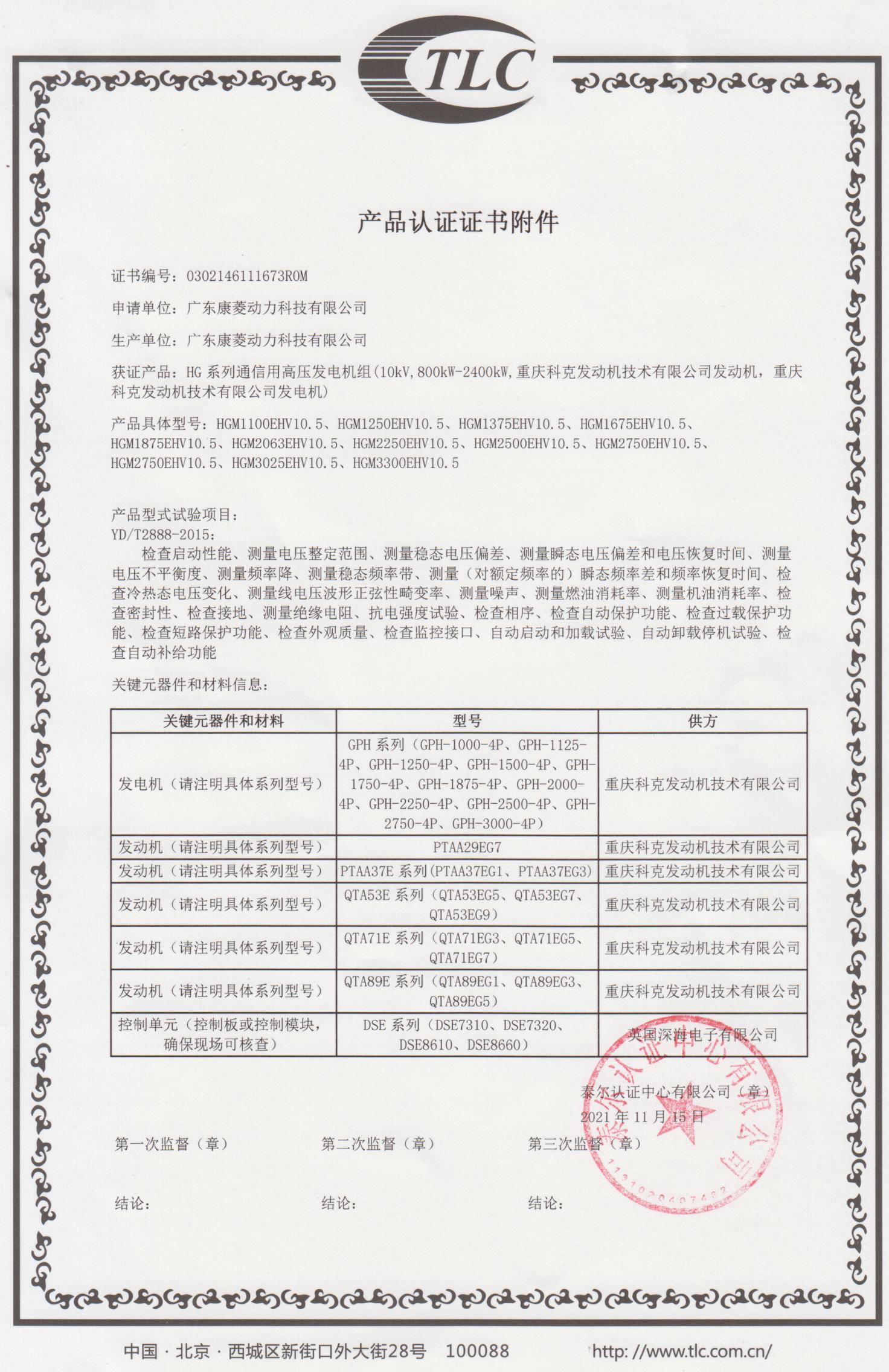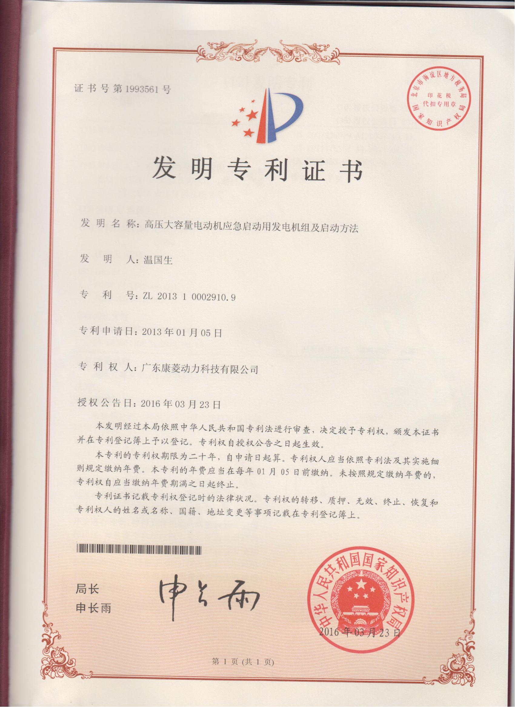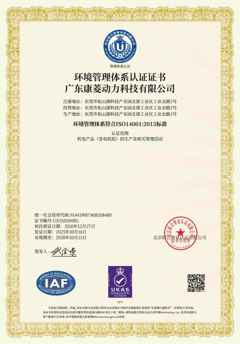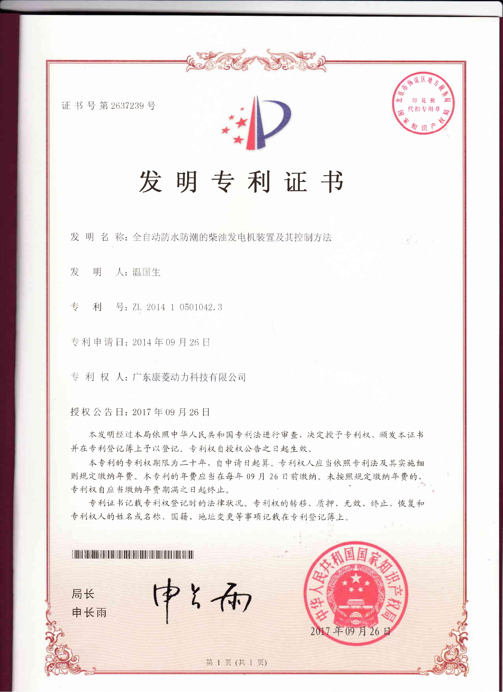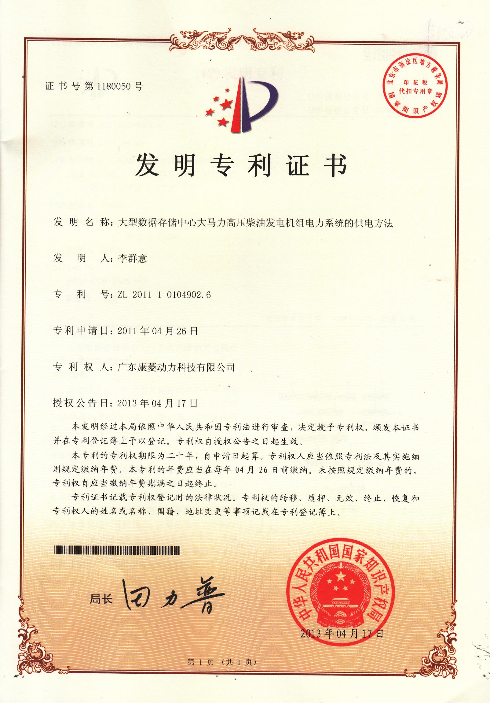 经过30多年的不懈努力,公司通过了IS09001质量管理认证,IS014001环境认证,OHSAS18001职业健康认证,GB/T29490知识产权管理体系认证;康菱系列发电机组产品先后通过CE认证、通信电源产品泰尔认证等认证,荣获国家级高新技术企业;曾荣获HG系列大马力柴油发电机组广东省自主创新产品、广东省著名商标、广东省名牌产品、广东省价格平台创始会员、东莞民营企业50强、连续多年广东省重合同守信用企业、东莞市装备制造业重点企业、东莞市中小民营创新产业化示范基地、东莞市专利培育企业、东莞市民营科技企业、东莞市质量协会理事单位;康菱HG系列发电机组获得国家标准委颁发采用国际标准产品证书、广东省质量技术监督局颁发的国际标准产品认可证书等殊荣。